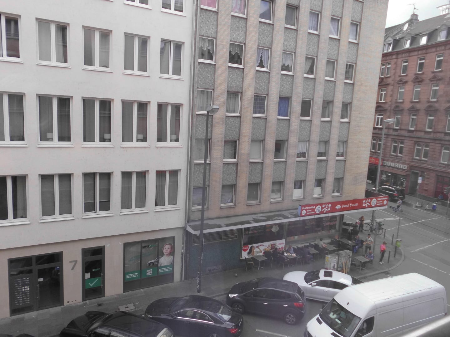 Blick aus dem Fenster nach rechts. Dort unten in dem Backshop haben wir gefrühstückt.