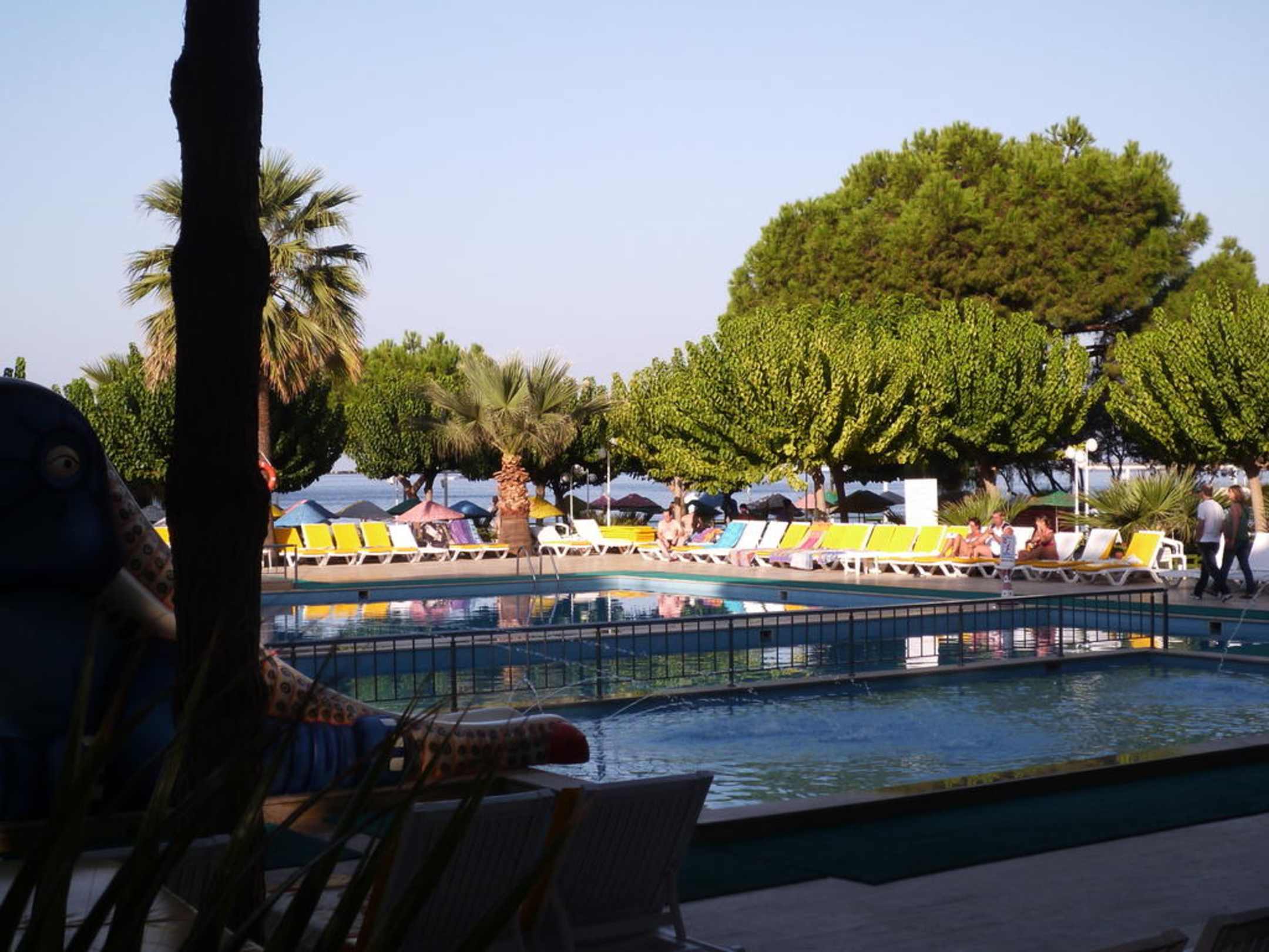 Blick vom Essensbereich zum Pool