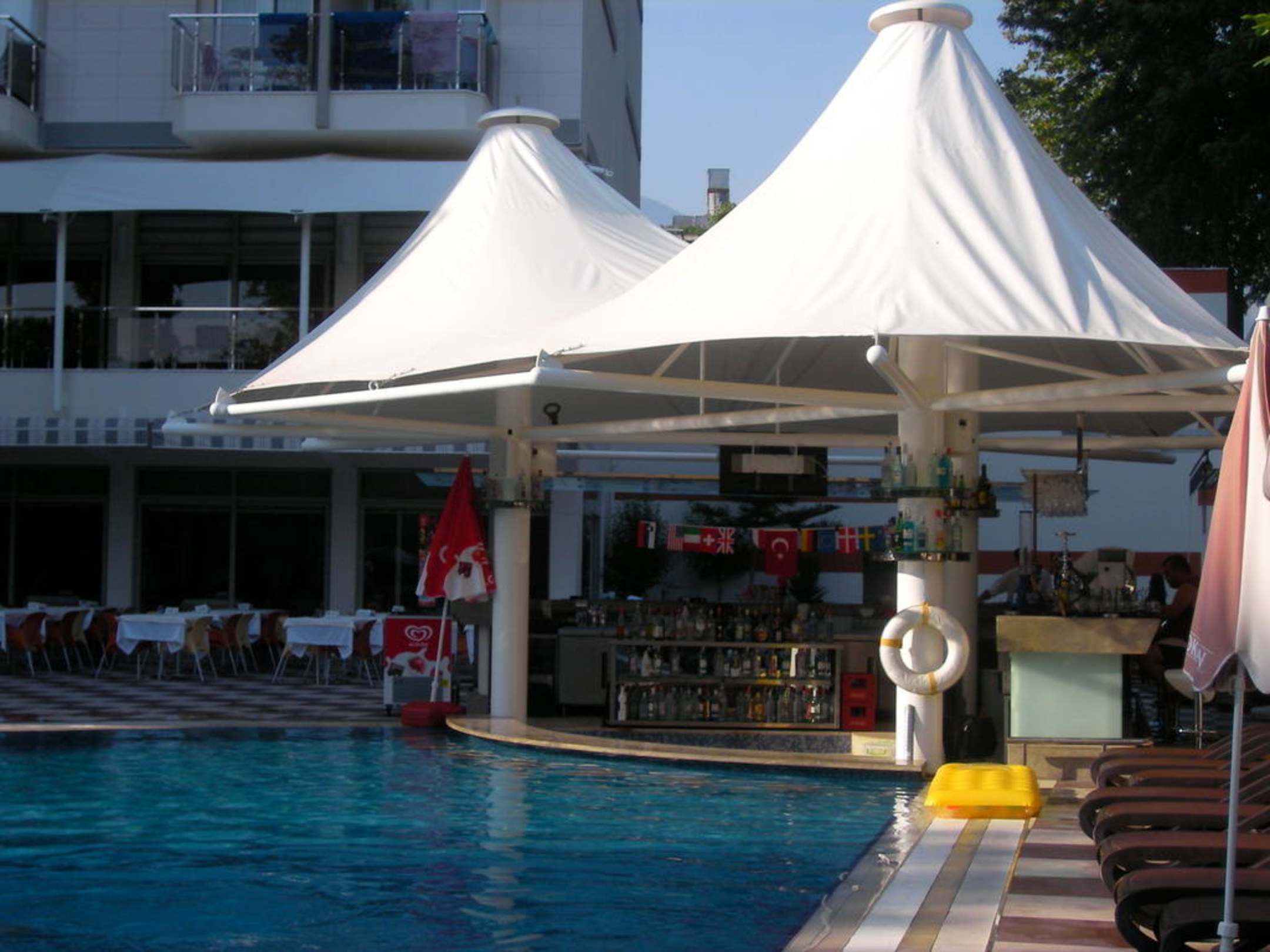 Pool & BarDirekt am Pool befindet sich die Hotelbar; in dem Pool sind Hocker, sodass man auch von dort aus etwas trinken kann