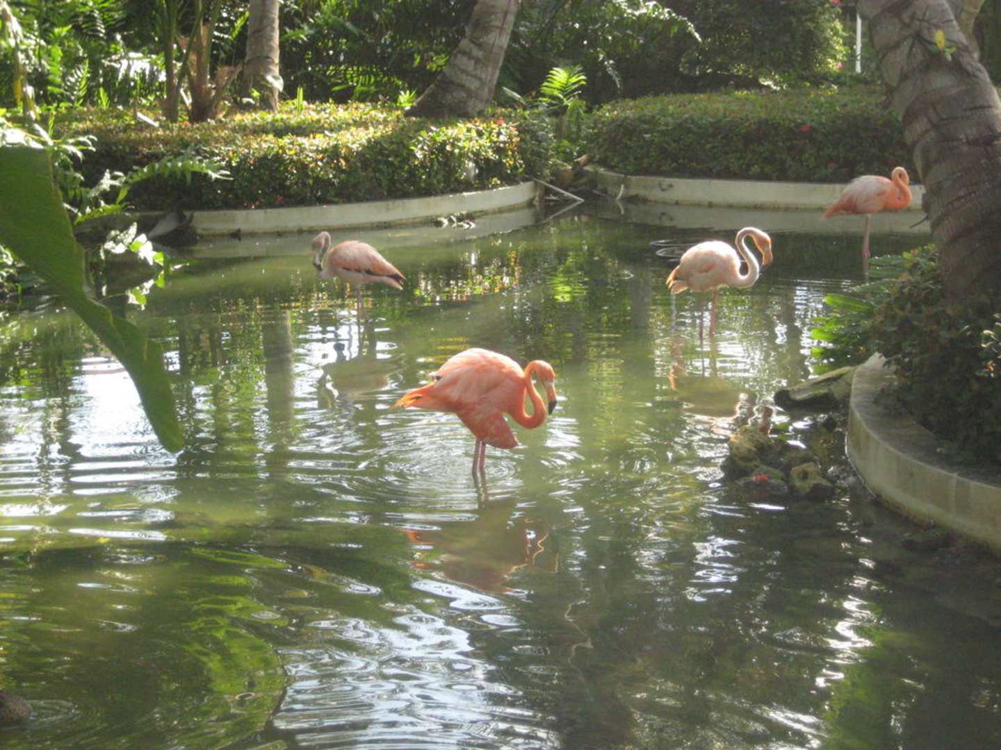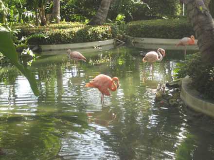 Flamingos im Teich vor der Rezeption