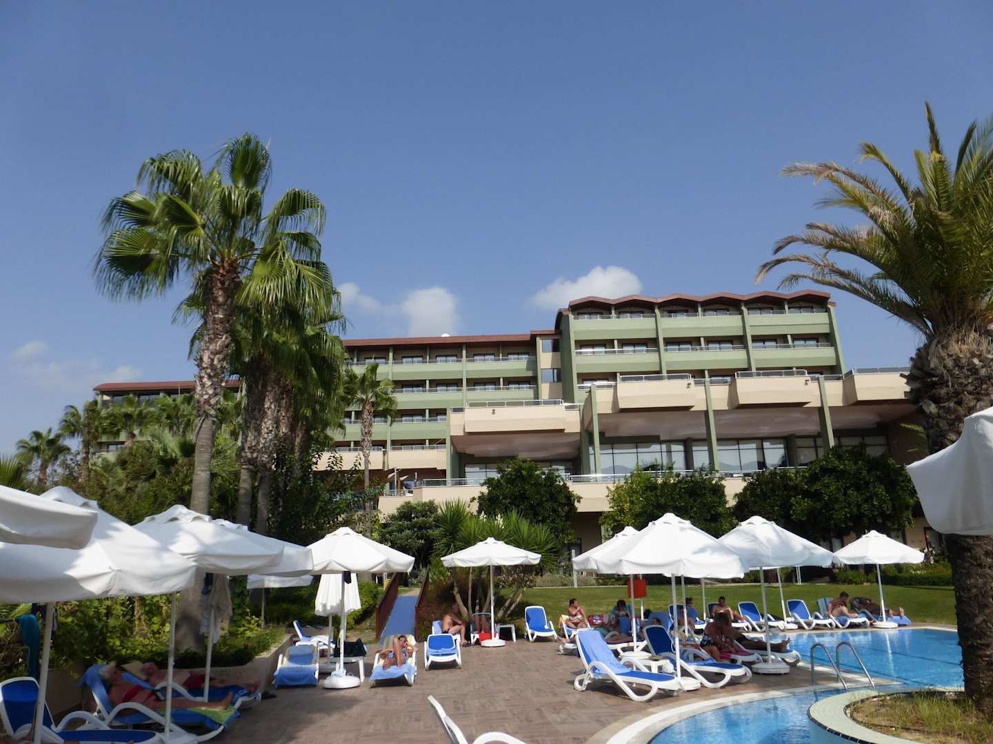 Blick vom Pool zum Hauptgebäude