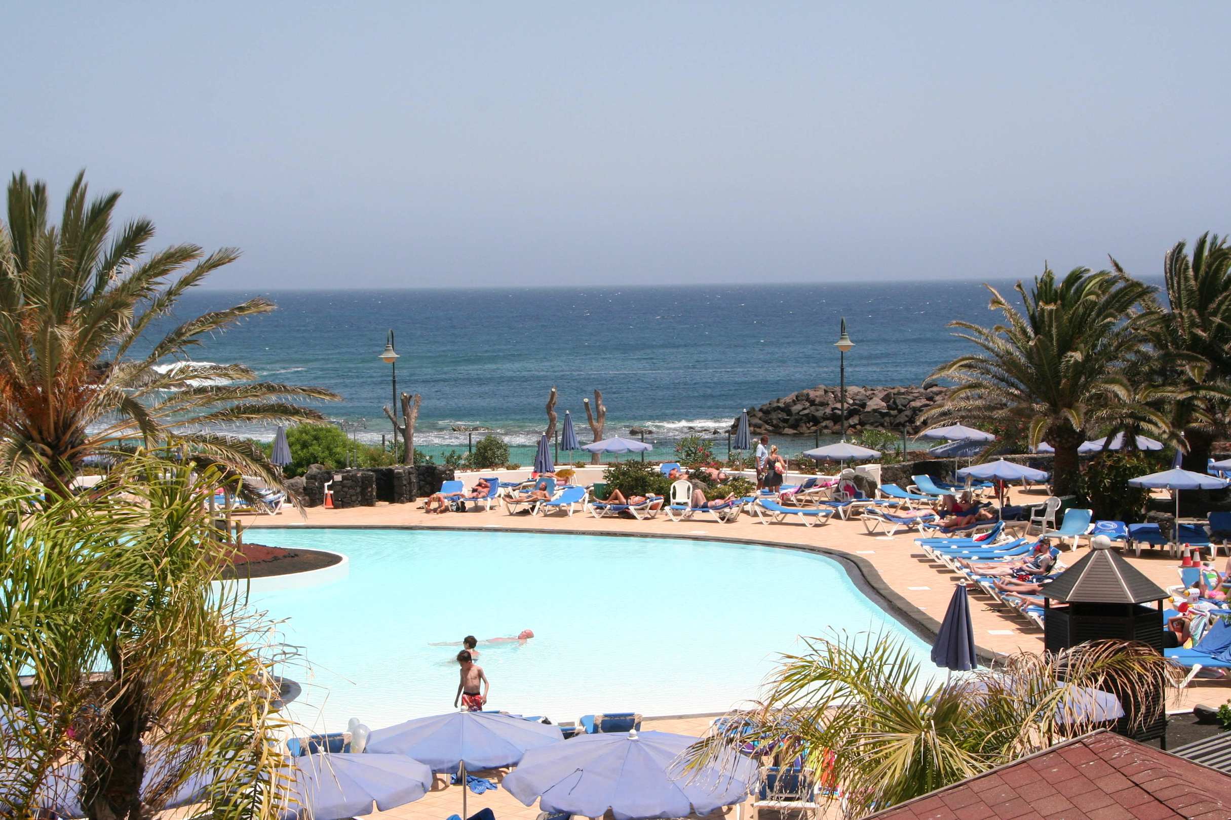 Blick vom Balkon aus auf Pool und Meer