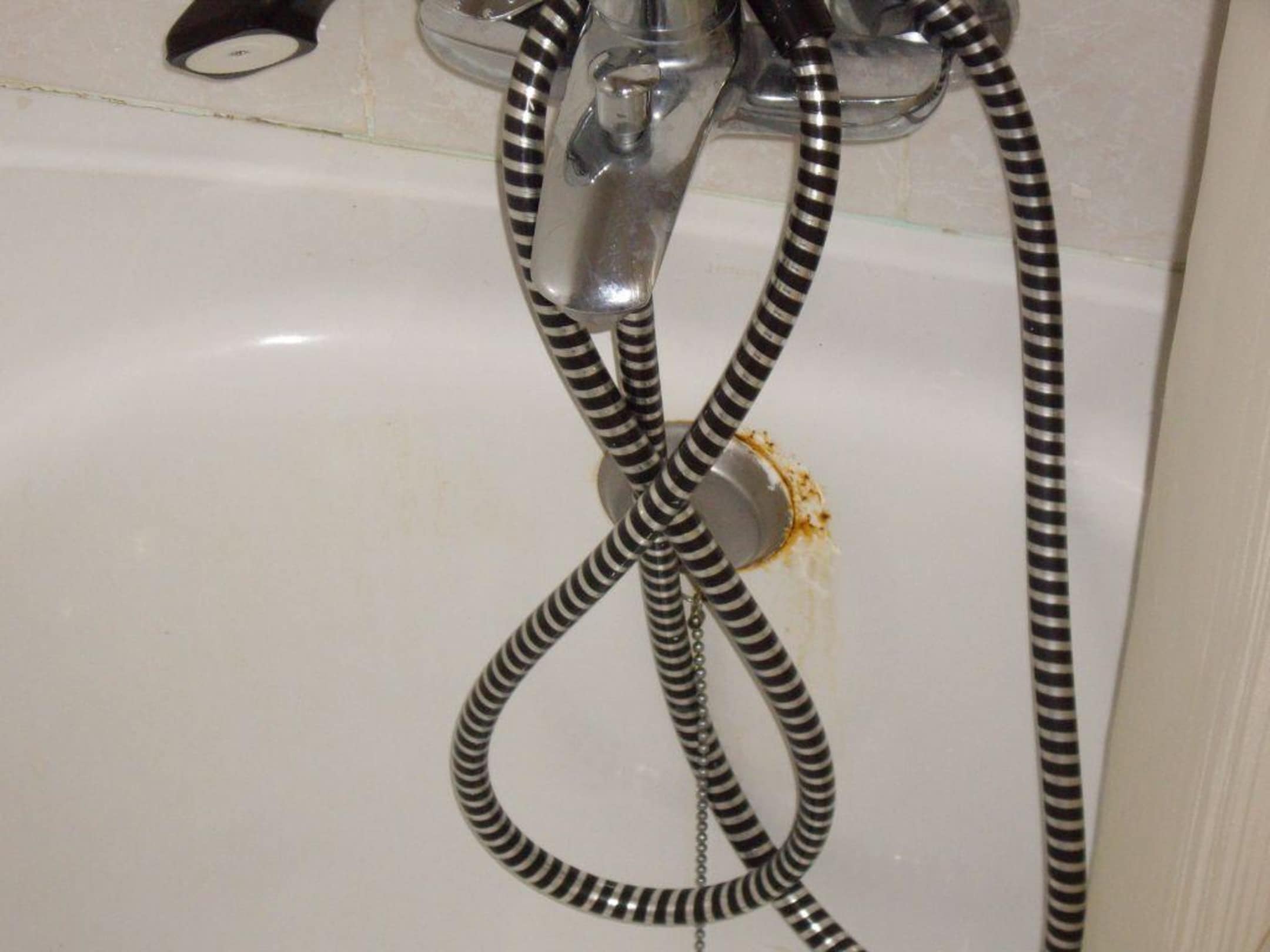Rostige Badewanne im Zimmer. Diese Roststellen sind gar nicht oder sehr schlecht ausgebessert.