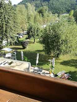 Blick vom Balkon auf die Gartenanlage