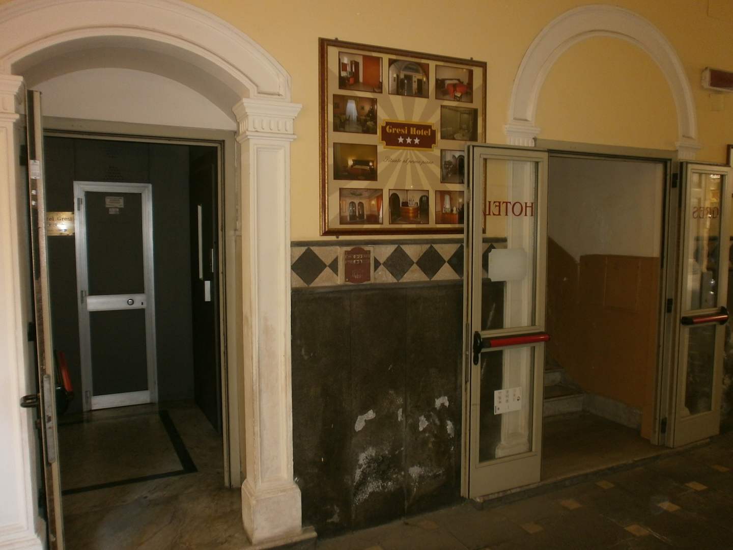Der Hof Eingang vom Hotel Gresi, Links Eingang mit Lift, rechts Eingang zum Treppenhaus.