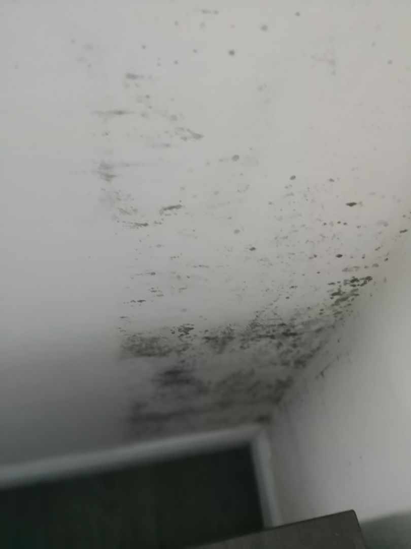 Schwarzschimmel an der Aussenwand hinter der Gardine direkt am Bett