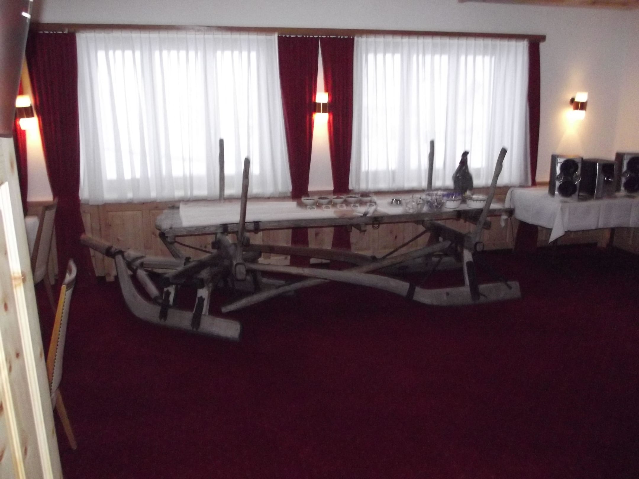Schlitten vom Frühstücksbuffet Auf diesem rustikalen Schlitten wird beim Frühstücksbuffet das Brot, die Butter und Marmeladen angerichtet
