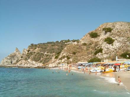Am Capo Vaticano am Strand mit Blick auf den Aussichtsturm gaz links