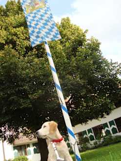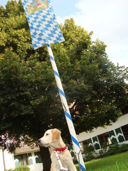 Der Hund ist KönigInnenhof von Gut Ising, Maibaum und unser Hund, der sich in Ising wie im zwqeiten Zuhause fühlt