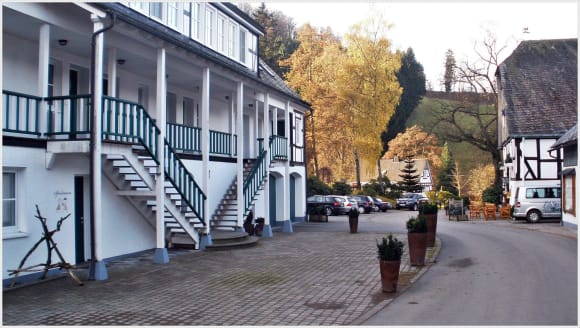Auf dem Geländelinks der Trakt mit den Ferienwohnungen - im Hintergrund das Haupthaus mit Restaurant und Hotelzimmern