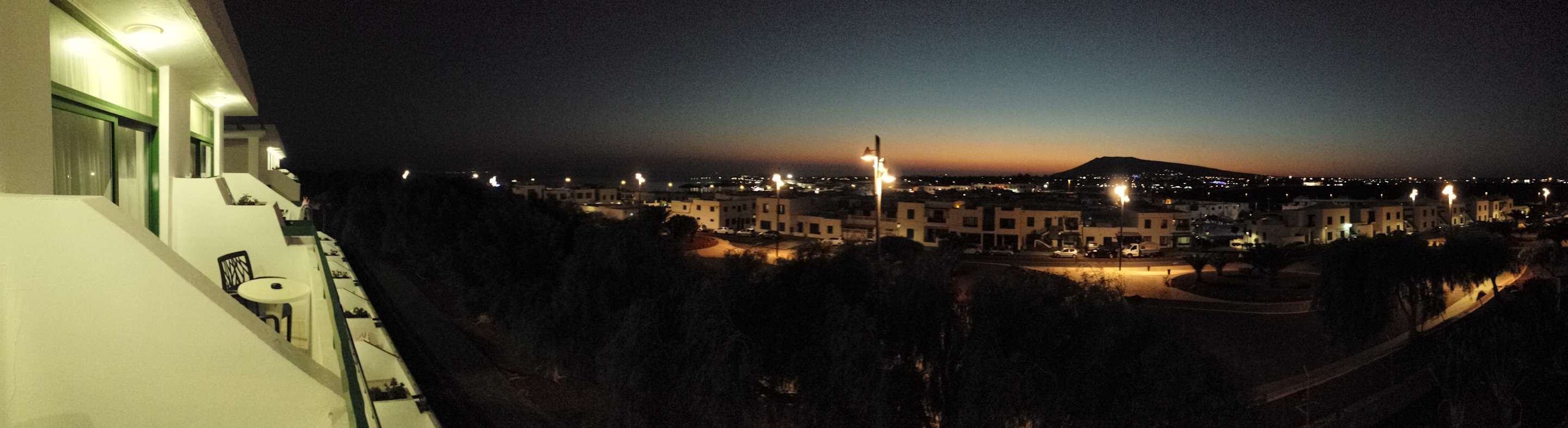Ausblick von Zimmer 2018 bei Nacht. Meerblick, Sicht auf die Stadt und den Volcano Montana Roja.