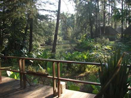 über diesen Holzsteg gelangt man zu den einzelnen Bungalows und Zimmern