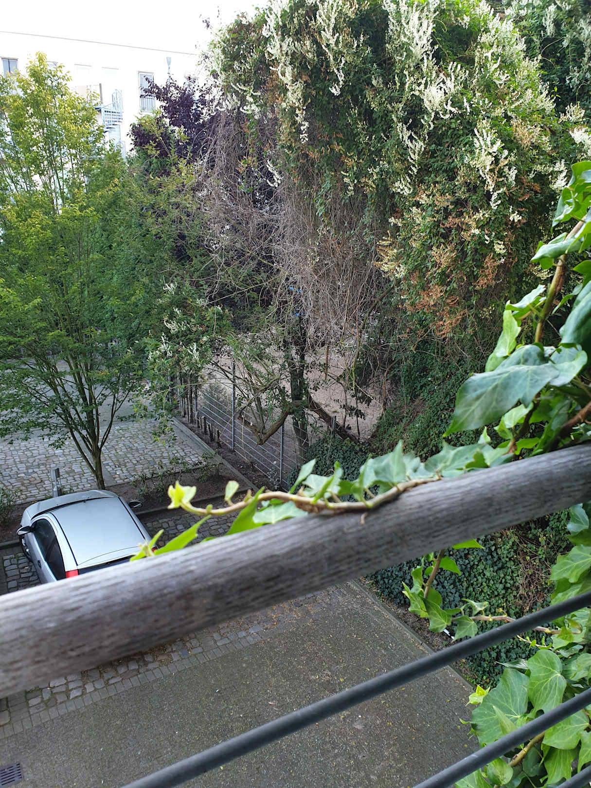 Rechts hinter den Zypressen der Spielplatz für die Sozialbauten