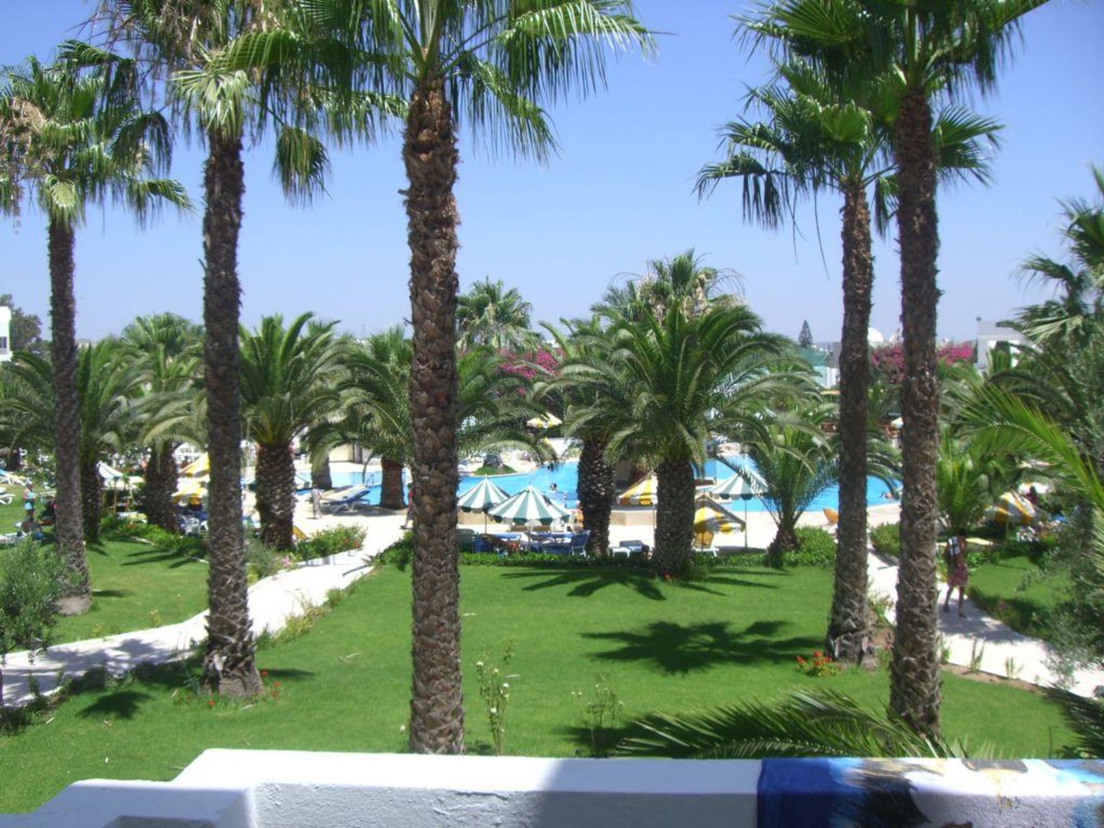 Der Ausblick aus unserem Zimmer auf die Anlage und den großen Pool