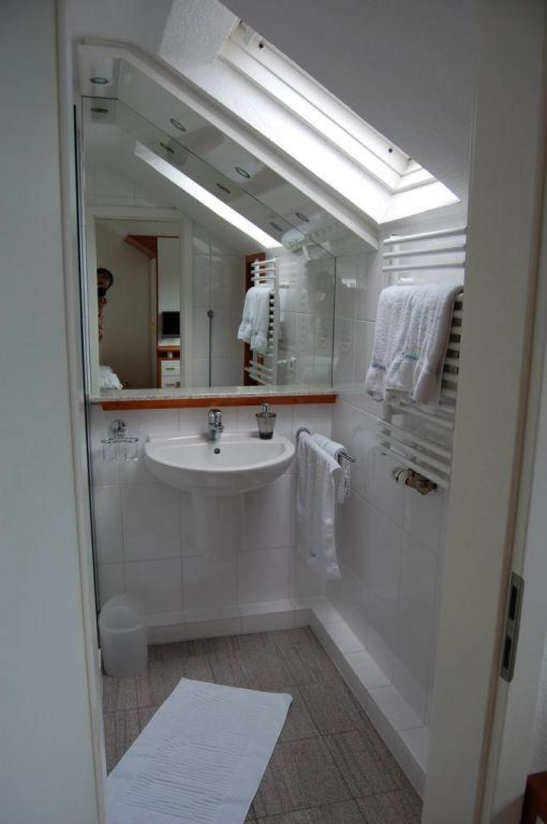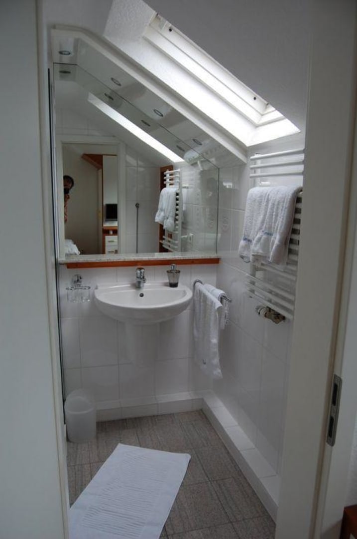 Auch im Bad alles clever gelöst: Einbauschrank rechts neben der Tür, für das Dachfenster eine "Verlängerung" für Leute mit etwas kürzeren Armen - an alles gedacht!