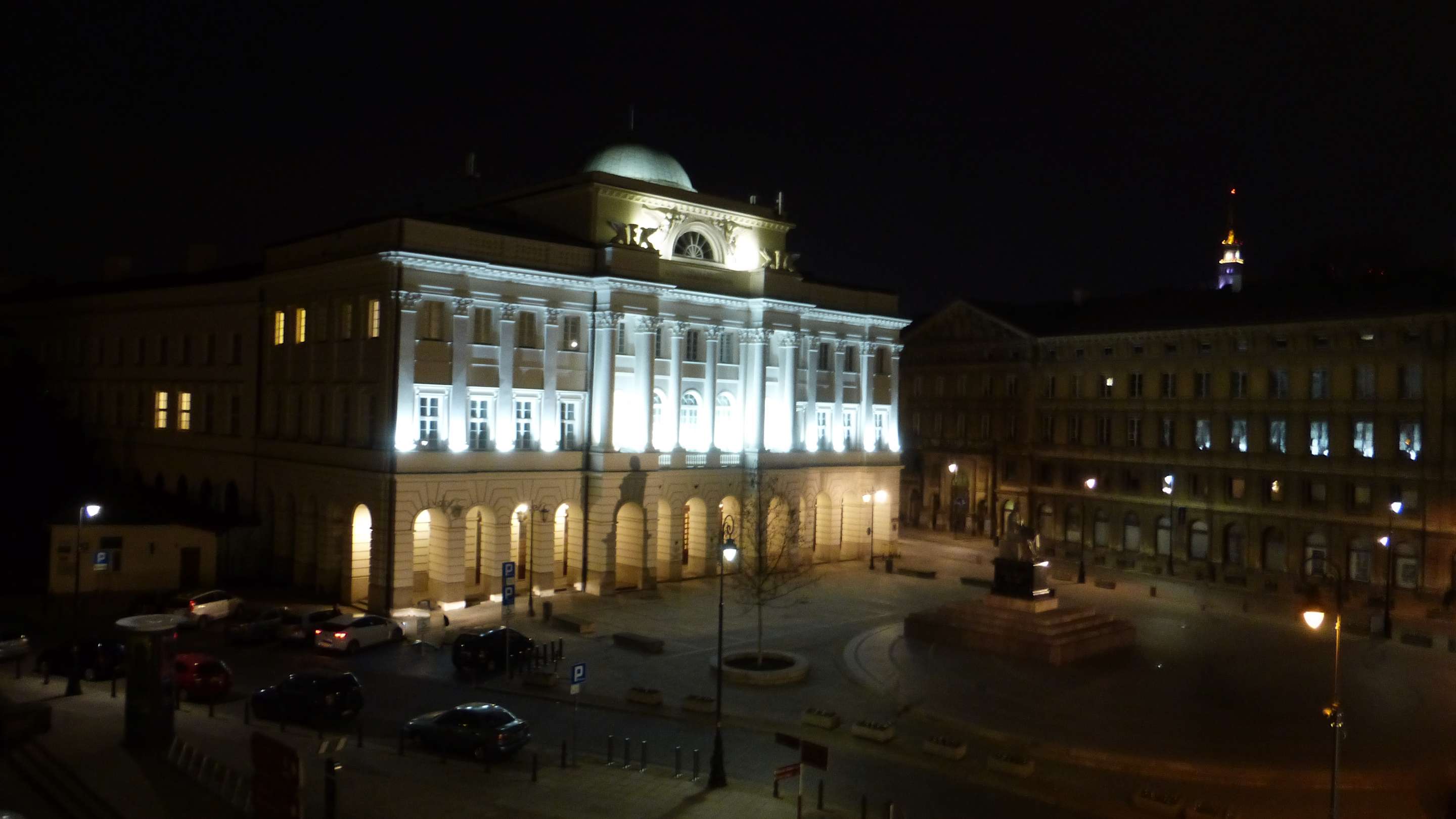 Hotel Harenda - Blick aus unserem Zimmer bei Nacht auf Nikolaus-Kopernikus-Denkmal und Staszic-Palast (jetzt Polnische Akademie der Wissenschaften).