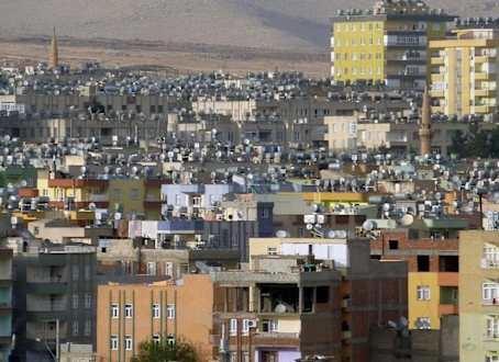 Über den Dächern von UrfaAuf den Dächern sieht man außer Satellitenschüsseln auf jedem Dach eine kleine Solaranlage mit Warmwasserbehälter.