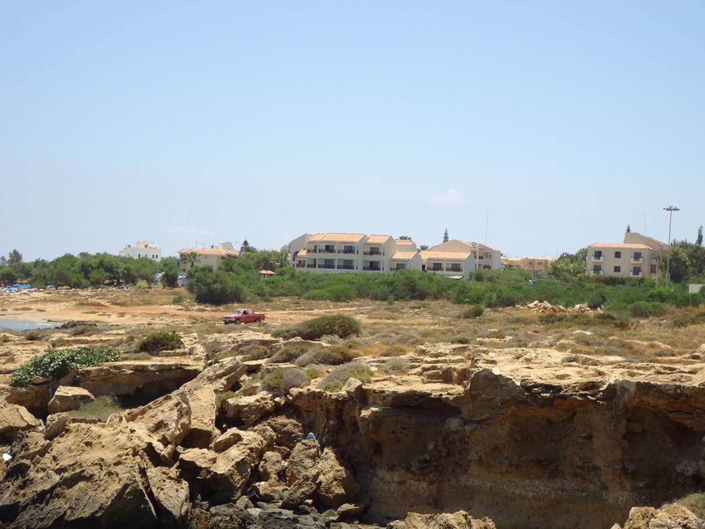 Ganz rechts im Bild mit 6 Fenstern ist das Hotel Harry`s. Bildmitte Mimosa Hotelkomplex. Ganz links der feine Sandstrand. Im Vordergrund die Küste