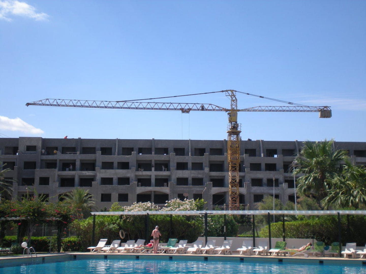 Blick vom Pool auf die Baustelle. Die Lärmentwicklung war teilweise nervend und in der ganzen Anlage zu hören. Baubeginn pünktlich um 7 Uhr.