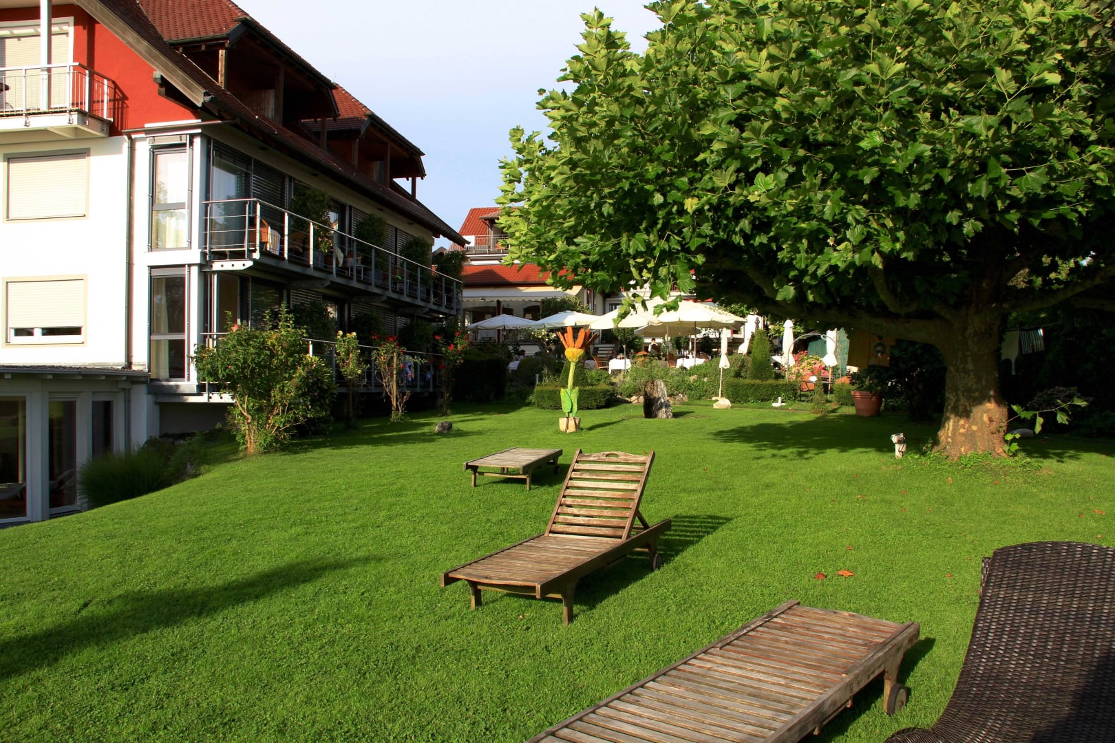 Blick auf Hotel und Liegewiese
