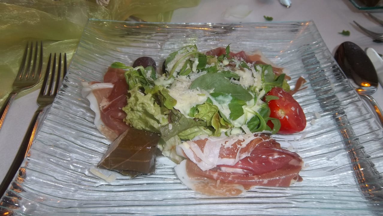 Als Vorspeise Salat mit Parmaschinken usw.