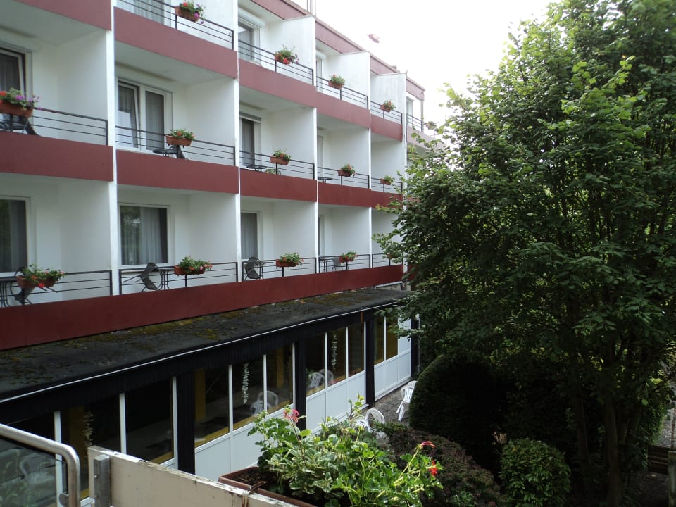 Blick vom Balkon auf den anderen Hotelflügel, unten ist die Schwimmhalle