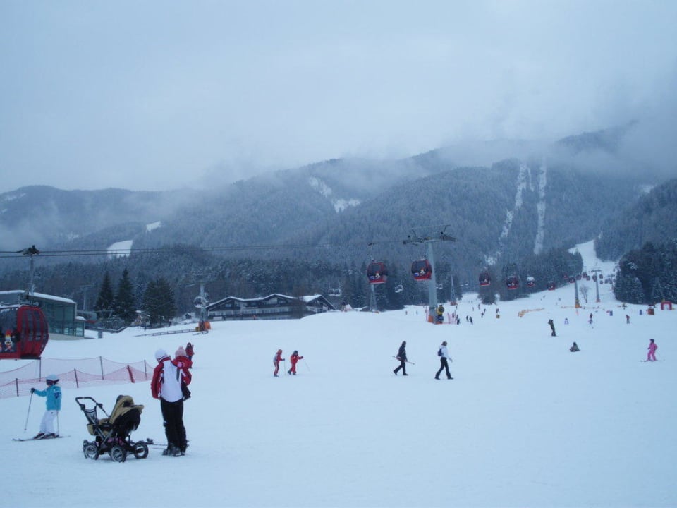 von der Talstation aus fotografiert, links etwas oberhalb befinden sich die weiteren zwei Gondenstationen, das Hotel Heinz ist ungefähr in der Bildmitte