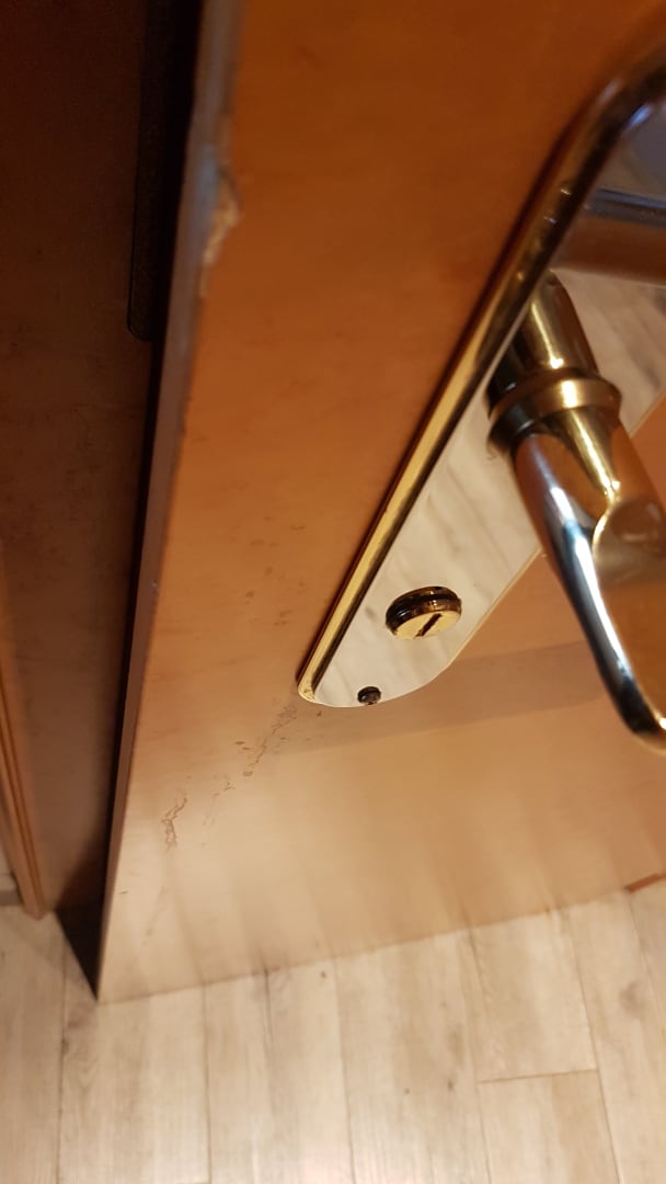 Beschädigte und verdreckte Tür zum Bad.