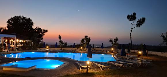 Links vom Pool befindet sich das Restaurant und Bar