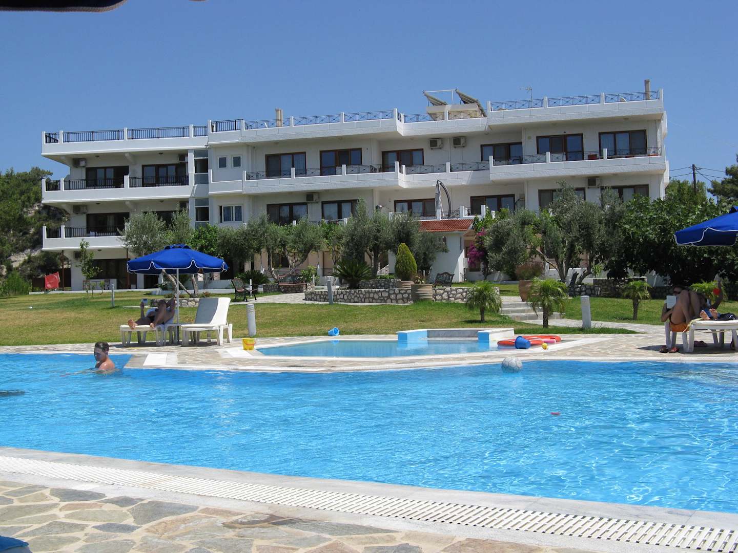 Blick von der Poolliege zum Hotel