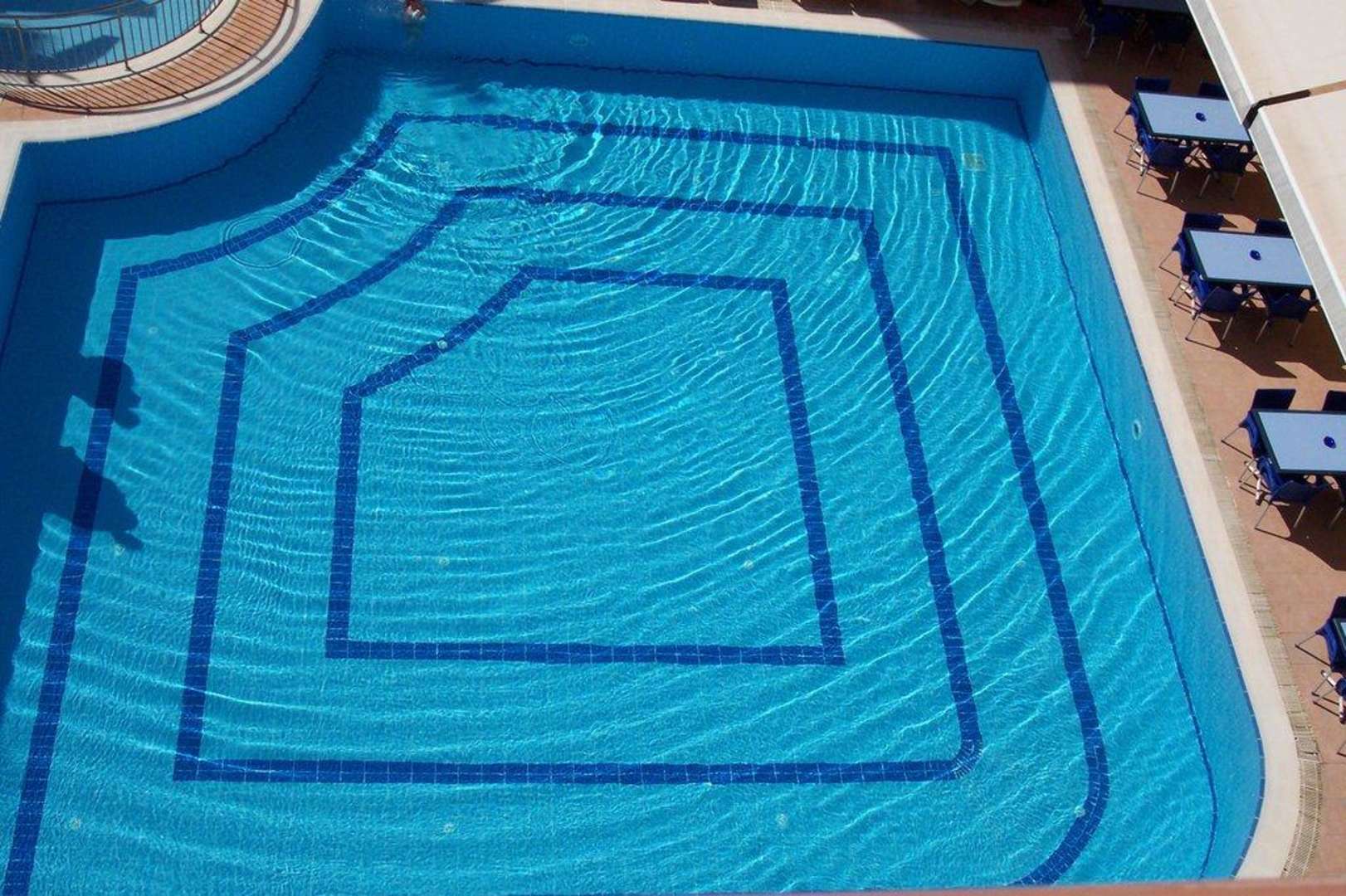Blick auf den Pool vom Balkon.