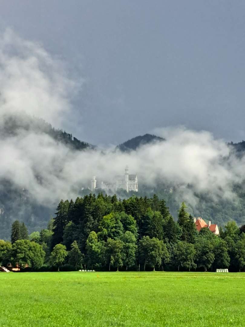 Schloss Neuschwanstein in tief liegenden Wolken