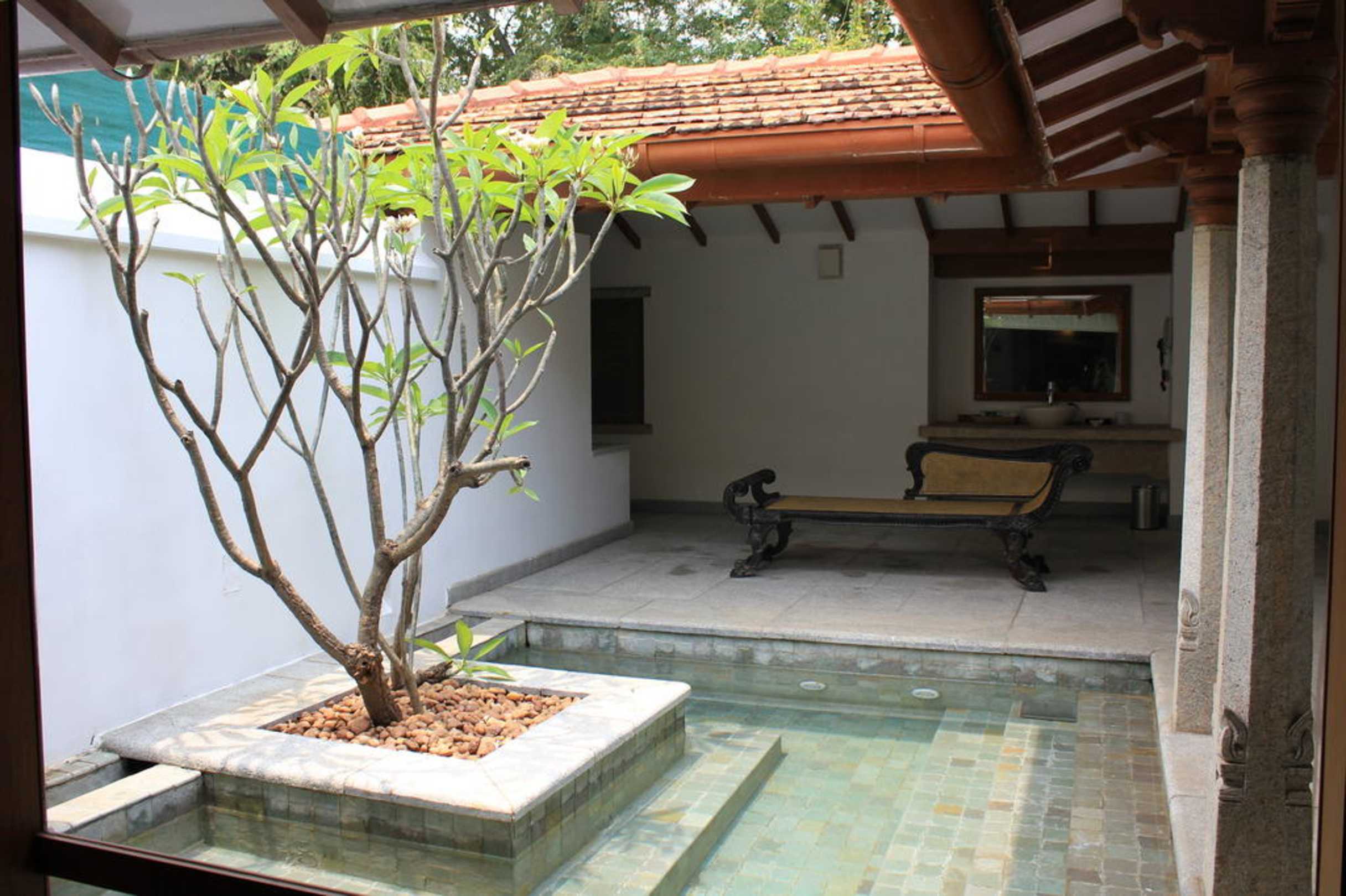 Ein eigener Pool!Das Zimmer war mit einer privaten Terrasse und eigenem Pool ausgestattet. Dahiner das offen gestaltete Bad.