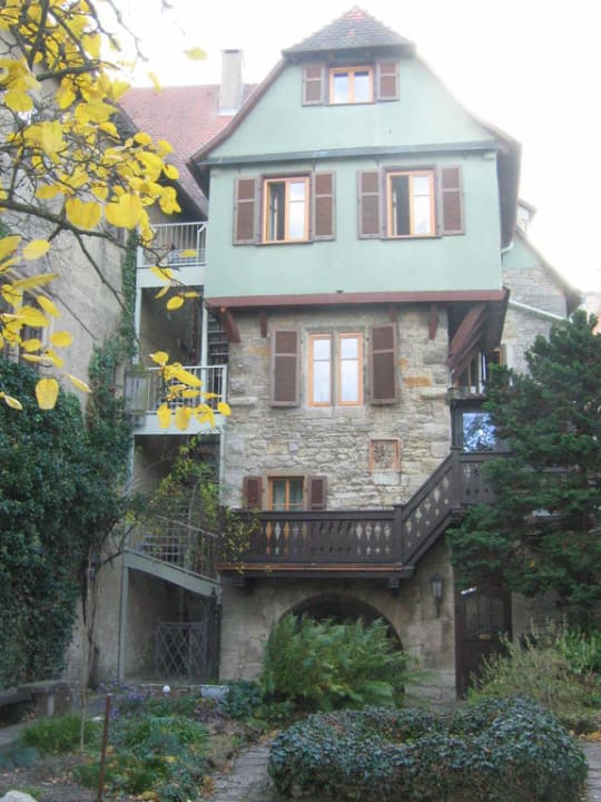 Hotel von der GartenseiteErst von der Gartenseite aus ist die klassische mittelaterliche Turmstruktur des Gebäudes erkennbar.