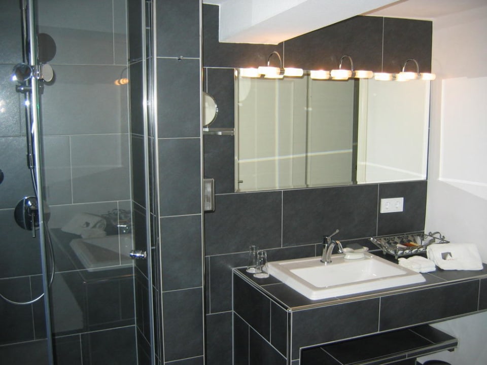 Das Bad ist in schwarz-weiß gehalten und recht geräumig.