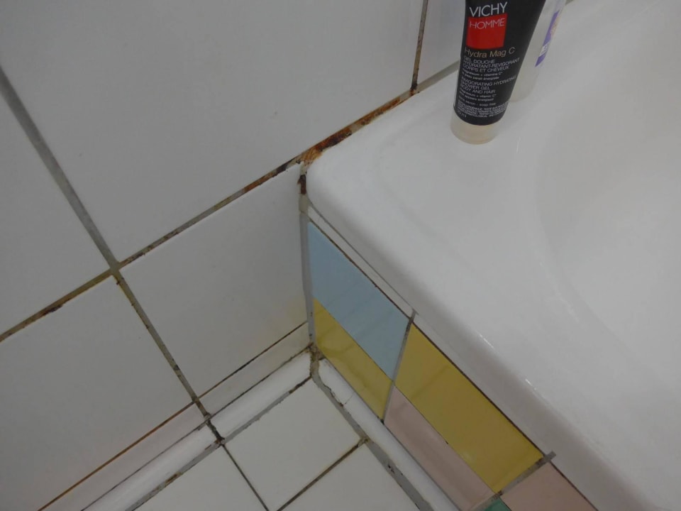 Altes Badezimmer mit dreckigen und schimmeligen Fugen
