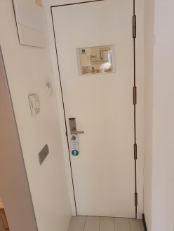 Die schmalste Hoteltür ever. Licht scheint vom Flur ins Zimmer rein.