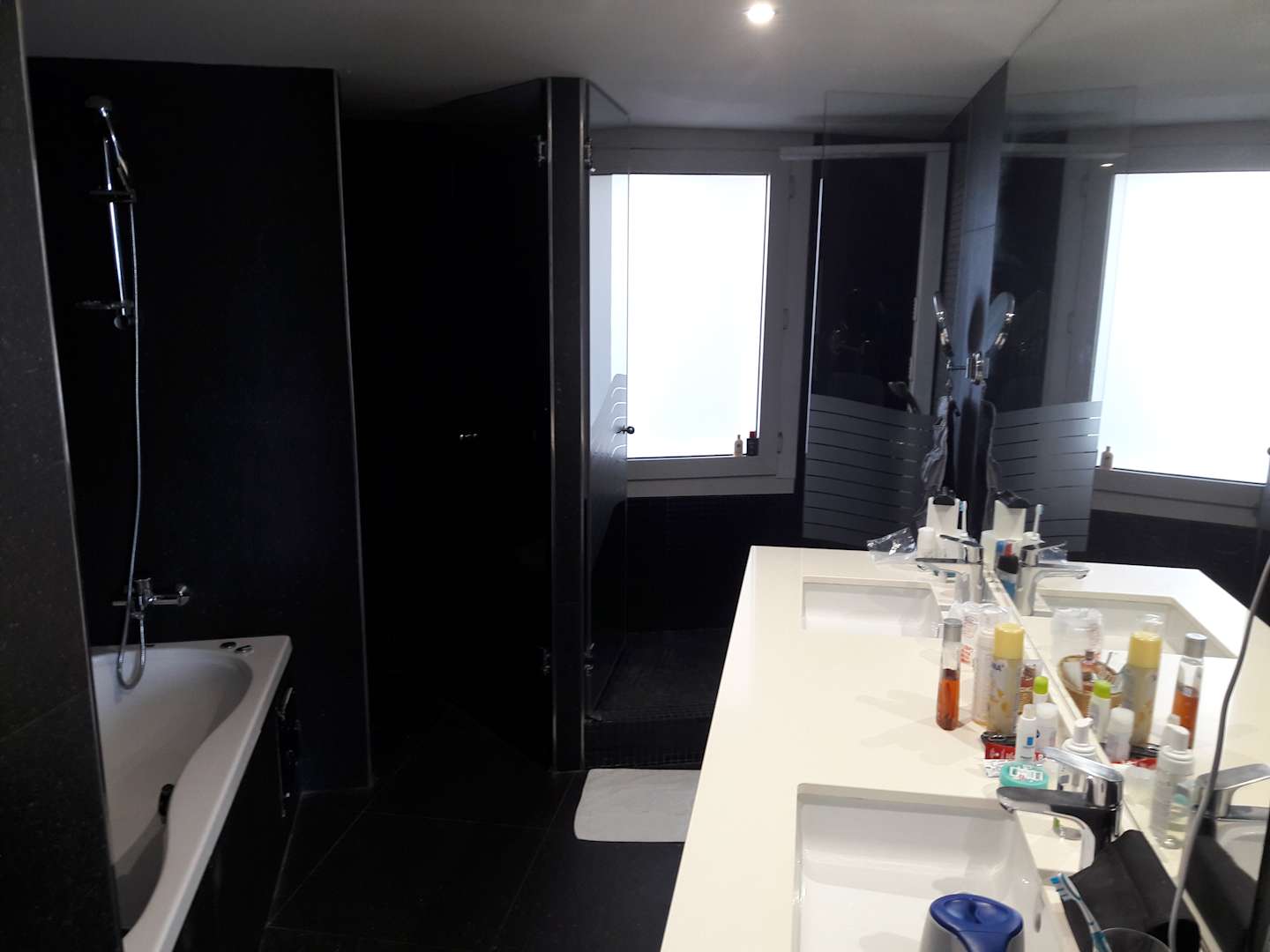 ZimmerLinks Badewanne, rechts Doppelwaschbecken, dahinter große Nasszelle und links WC mit Glastür