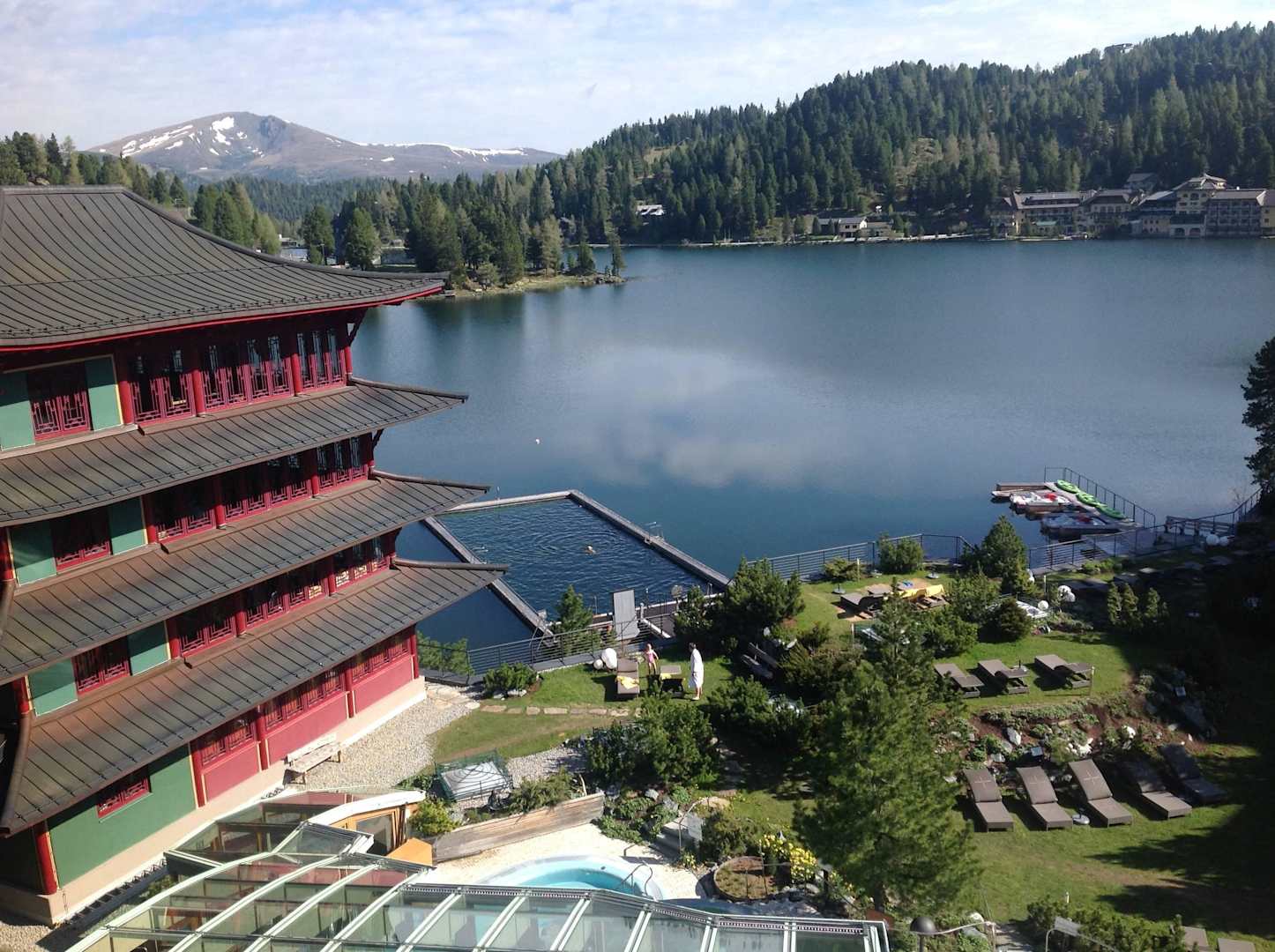 Liegewiese / Seebad und ChinaturmAusblick aus Hotelzimmer auf den See inklusive Liegebereich und Whirlpool