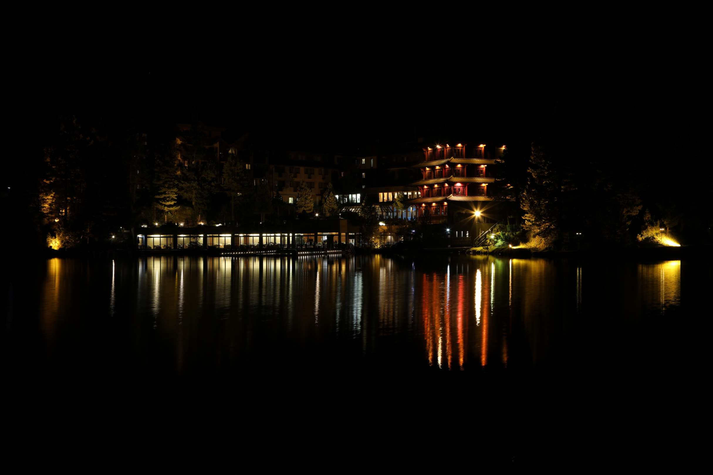 Ansicht des Hotels bei Nacht von der gegenüberliegenden Seeseite gesehen!