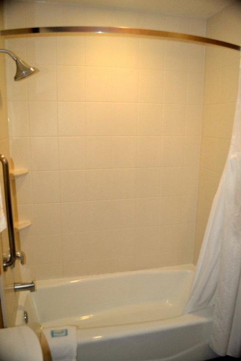 Die Badewanne mit Dusche hat eine gebogene Duschvorhangstange