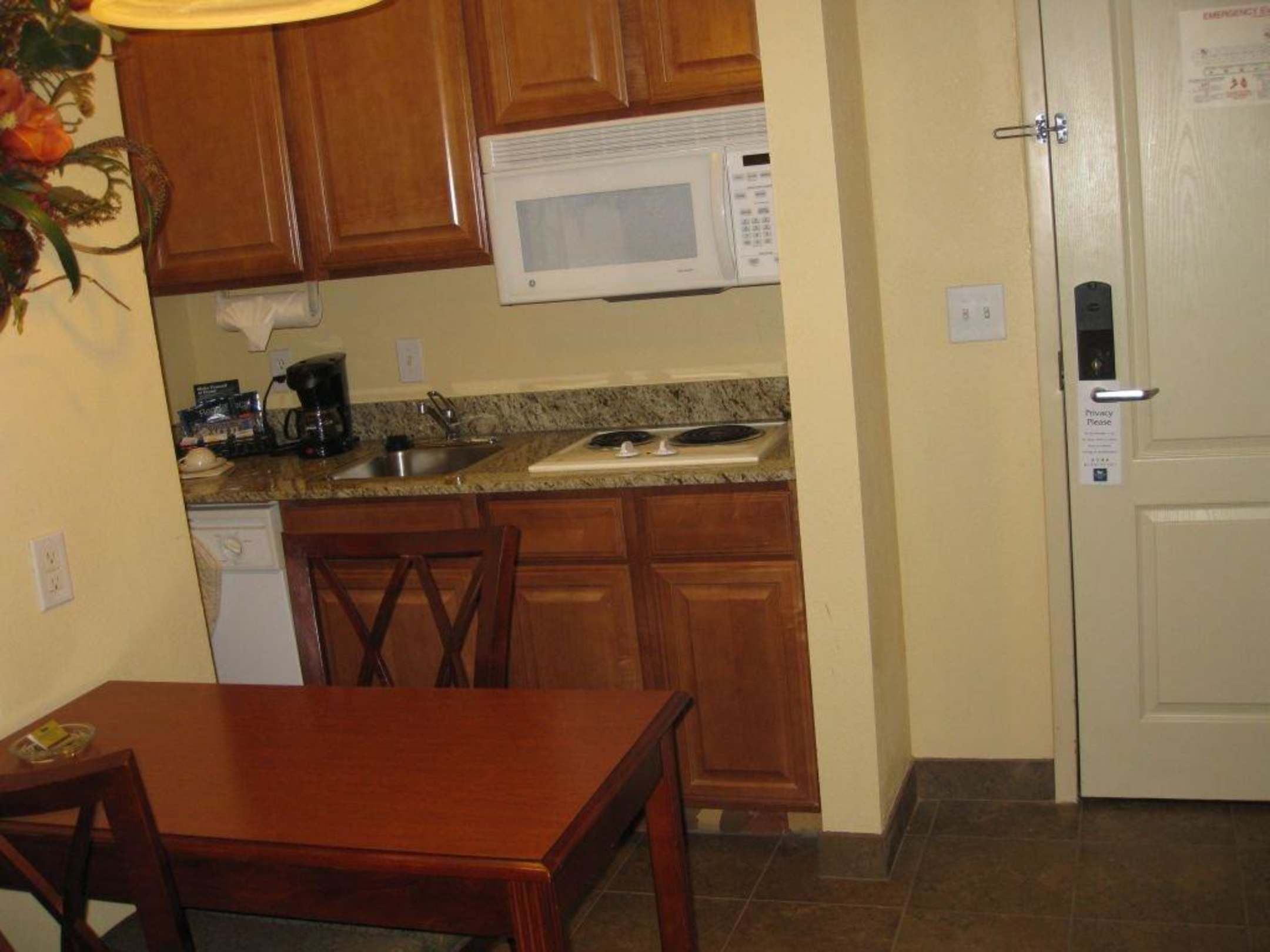 Küchenzeile mit KühlschrankLinks der Kühl-Gefrierschrank, Herd und Microwelle, alles sehr sauber und gepflegt.