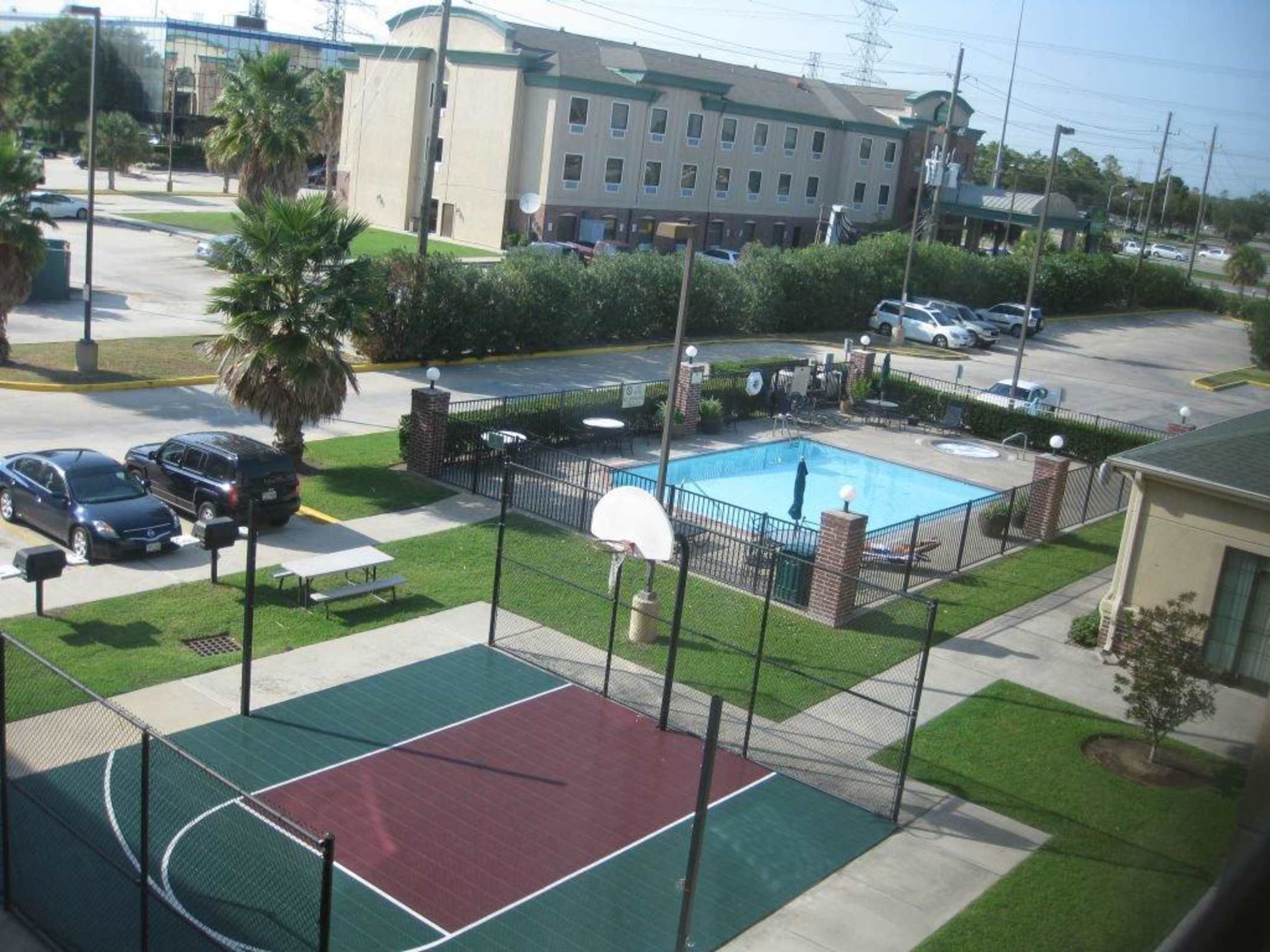 Blick auf den Pool und Basektball Platz