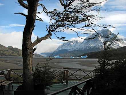 Ausblick von der TerrasseHosteria Lago Grey, mitten im Nationalpark Torres del Paine. Es gibt wohl kaum ein Hotel mit besserem Ausblick!