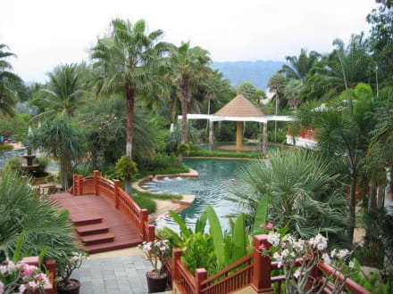 Einen Teil der Gartenanlage ist auf dem Bild zu sehen. Das Hotel heisst Hotspring Beach und liegt zwischen Phuket Town und Khao Lak. Eine Stadt in der Nähe heisst Khok Kloi