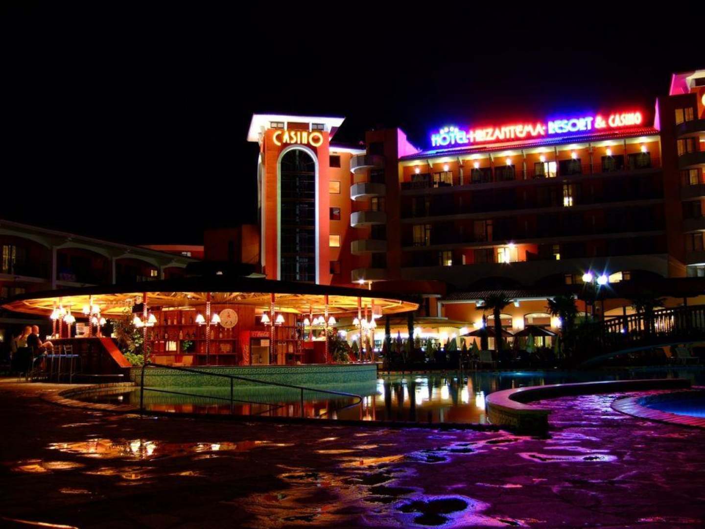 Nachtaufnahme über den Pool Richtung Poolbar und Hotel.