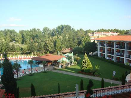 Blick auf Liegewiese und Poolbar