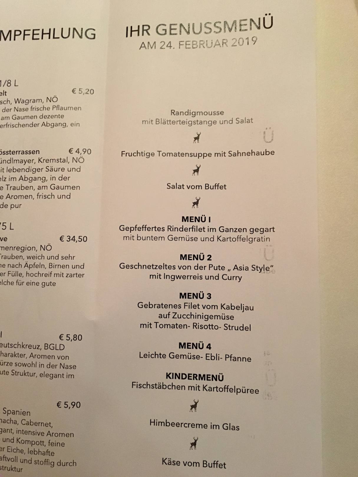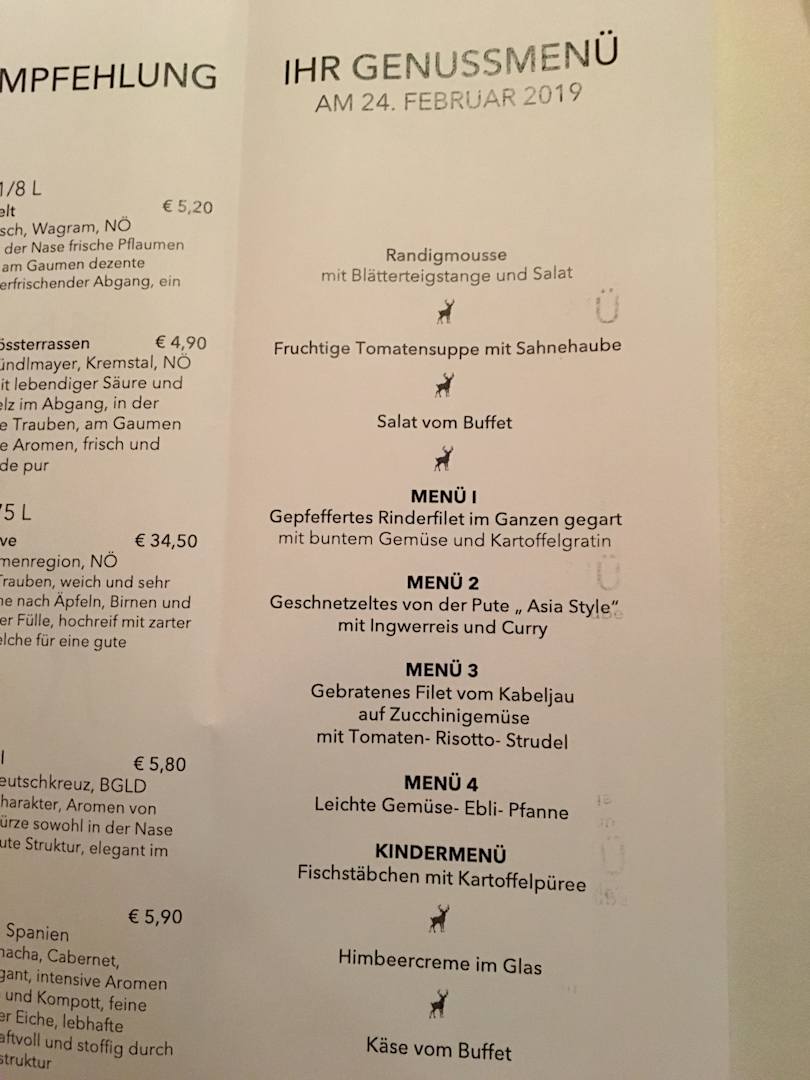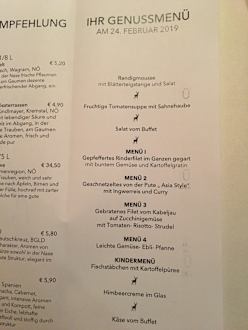 Beispiel eines Menüs. Da das Format des Originalfotos hochkant ist, wurde hier leider der Nachtisch (Himbeercreme im Glas und Käse vom Buffet) abgeschnitten.