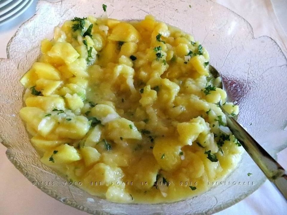Schüssel mit Kartoffelsalat beim Salatbüffet.