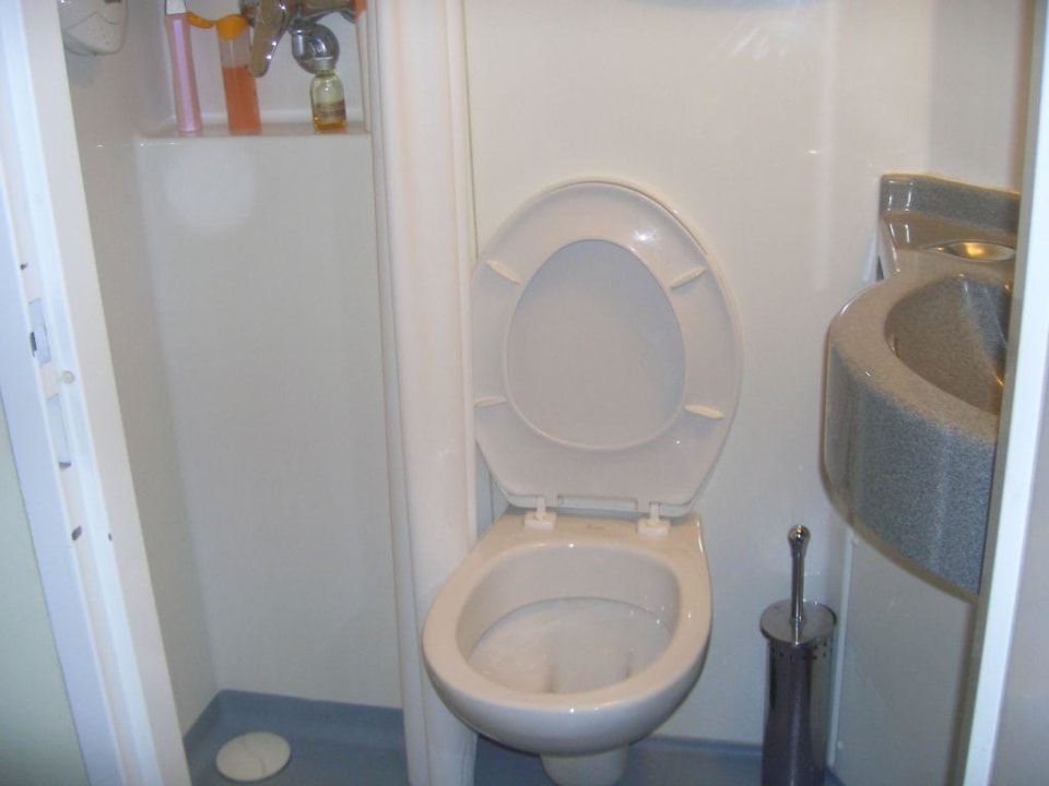 Links die Dusche, in der Mitte das WC und rechts das Waschbecken...
